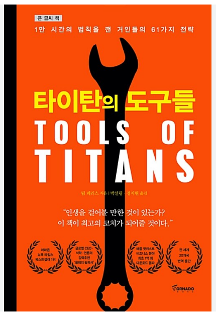 "Tools of Titans"는 Tim Ferriss가 그의 팟캐스트 "The Tim Ferriss Show"에서 인터뷰한 200명 이상의 최고 전문가들 중 일부의 경험, 조언 및 인사이트를 모은 책이다. 이 책은 건강, 운동, 비즈니스, 투자, 예술, 재무, 기술 등 다양한 분야에서 수많은 전문가들로부터의 조언을 제공하며, 이들의 실패와 성공에 대한 이야기를 들려준다.책은 세 가지 섹션으로 구성되어 있다. 첫 번째 섹션인 "Healthy"에서는 다이어트, 운동 및 뇌 건강과 관련된 인터뷰가 수록되어 있다. 두 번째 섹션인 "Wealthy"는 비즈니스, 투자 및 재무에 관한 이야기를 담고 있다. 마지막으로, "Wise"에서는 심리학, 철학, 생산성, 기술 및 예술 분야의 전문가들과의 인터뷰가 수록되어 있다.책에는 팀 페리스가 인터뷰한 인물들의 특징적인 경험, 인사이트 및 조언 등이 담겨 있다. 이들은 팀 페리스와의 인터뷰를 통해 어떤 기술, 규칙 또는 전략을 성공적으로 적용하여 이룬 성공의 비결을 이야기한다.</p> <p>"Tools of Titans"는 대부분의 사람들이 훌륭한 인생을 살기 위해 필요한 다양한 전문 분야의 전문가들의 경험과 조언을 제공하는 책입니다. 이 책에서는 200명 이상의 성공적인 인물들, 운동 선수, 미디어 관계자, 음악가, 기업가, 투자자, 컴퓨터 고수, 외교관 등 다양한 인물들의 인터뷰와 조언, 라이프하크, 스킬 및 자기 개발 팁 등을 소개하고 있습니다.이 책은 크게 세 부분으로 구성되어 있습니다.첫째, "Healthy" (건강) 파트에서는 건강과 관련된 다양한 정보를 소개합니다. 이 파트에서는 주로 건강한 식습관, 운동, 수면 등에 대한 이야기가 나옵니다.둘째, "Wealthy" (재산) 파트에서는 돈과 관련된 정보를 다룹니다. 이 파트에서는 돈을 버는 방법과 투자에 대한 이야기가 나옵니다.</p> <p>셋째, "Wise" (지혜) 파트에서는 인생에 대한 관점을 바꾸고 자신의 삶을 개선하기 위한 방법을 소개합니다. 이 파트에서는 명상, 가치관, 자기 개발, 시간 관리 등의 이야기가 나옵니다.이 책은 각각의 파트에서 각 분야의 전문가들과 인물들과의 인터뷰를 통해 제공되는 다양한 정보들이 매우 유용하며, 독자는 이 책에서 제공하는 정보들을 실제 삶에 적용해보고 자신의 삶을 개선할 수 있을 것입니다. 이 책은 특히 라이프 스타일, 자기 계발 및 인생을 좀 더 풍요롭게 만드는 데 관심이 있는 독자들에게 추천합니다.